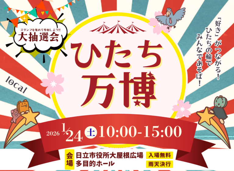 1月24日(土)に、ひたちファンクラブの初イベント「ひたち万博」を開催します。「好き」がつながる!ひたちの輪でみんなであそぼ!をテーマに、日立市の魅力をぎゅっと詰め込んだイベントとなっています。ぜひ遊びに来てください!